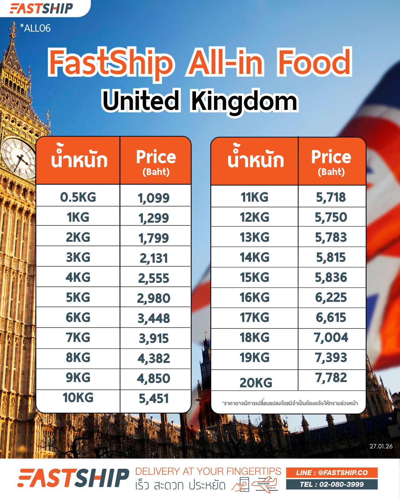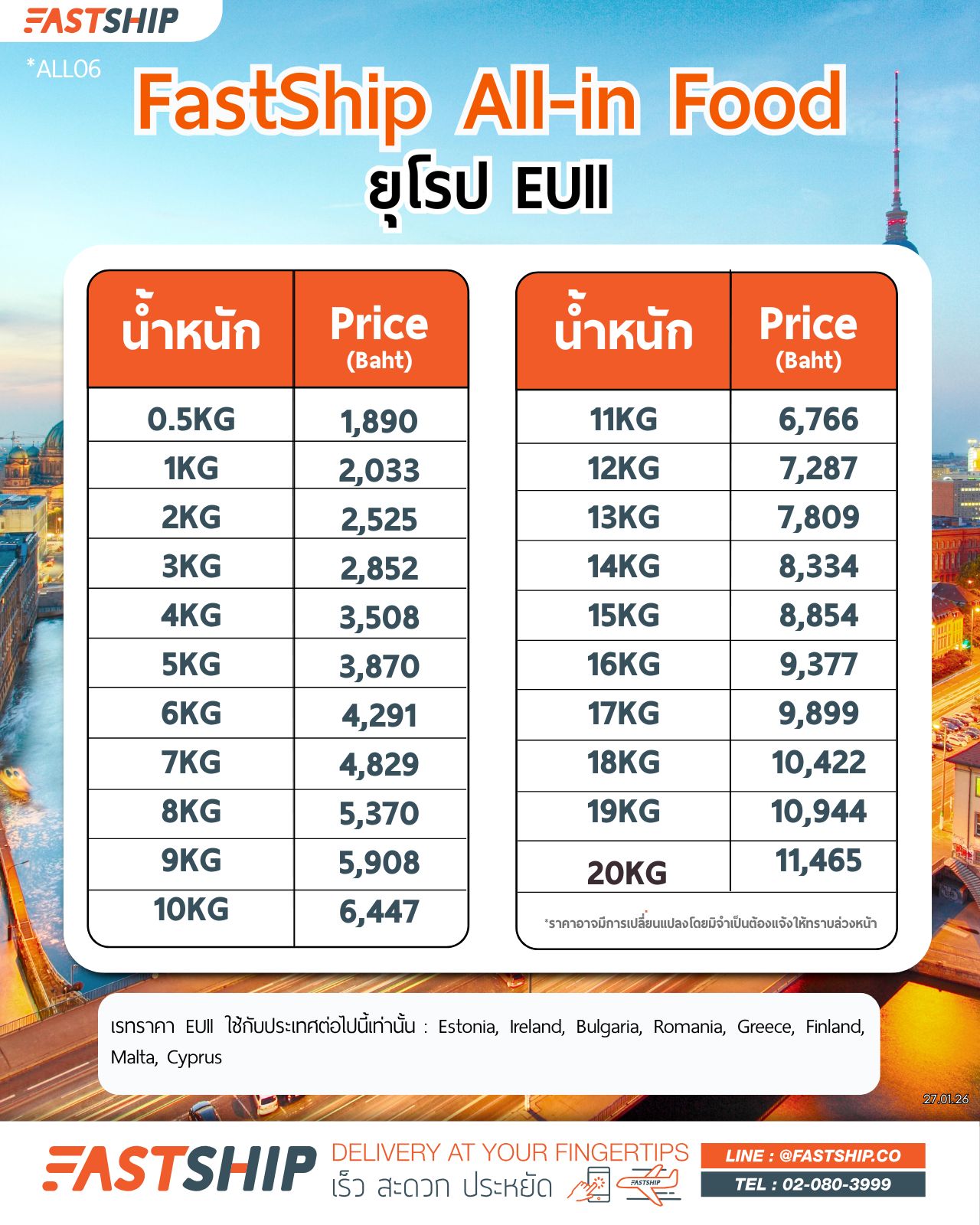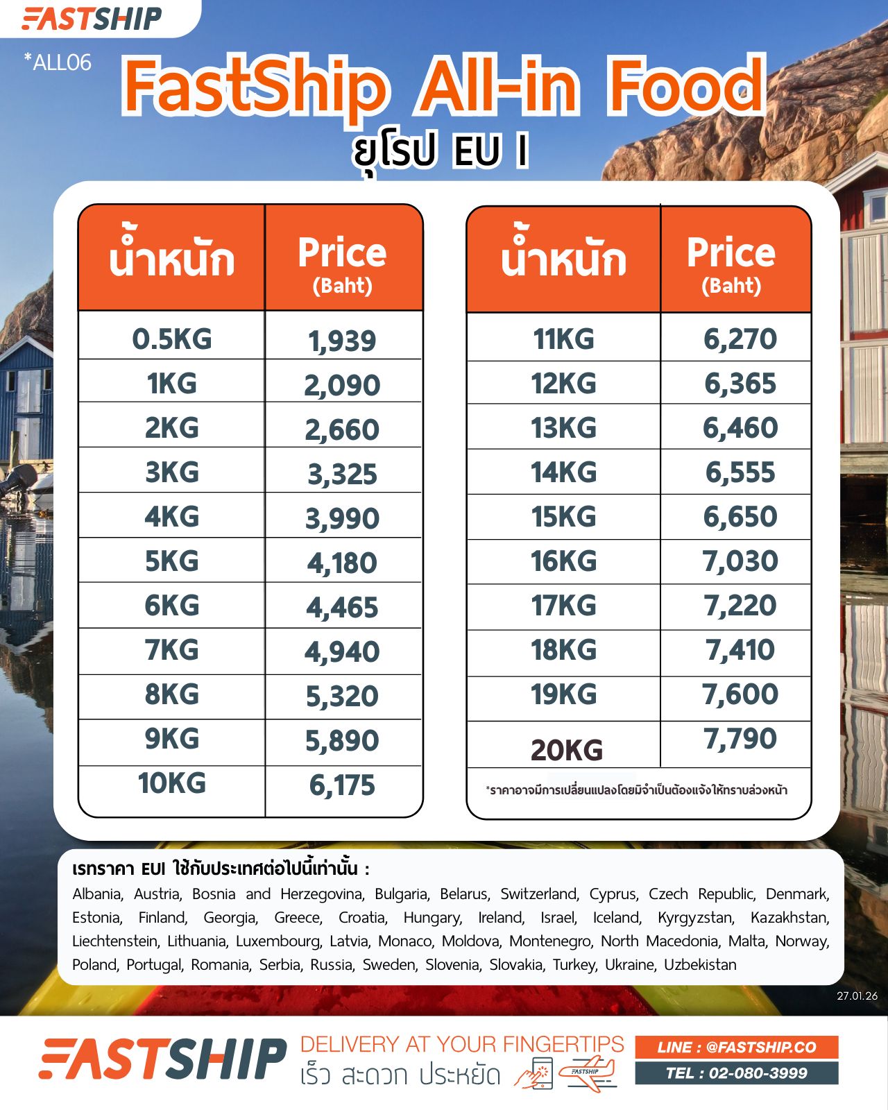 FastShip All In คือบริการส่งพัสดุไปต่างประเทศแบบเหมารวมภาษีพร้อมเคลียร์เอกสาร ส่งด่วนทางเครื่องบิน โดยให้บริการขนส่งไปประเทศโซนยุโรป เรามีพนักงานผู้เชี่ยวชาญที่พร้อมดูแลคุณทุกขั้นตอน ตั้งแต่การบริการเข้ารับพัสดุที่หน้าบ้าน การแพ็คสินค้า รวมถึงดูแลดำเนินการจัดการเอกสารส่งออก และมีทีมดูแลพร้อมเคลียร์สินค้า จัดการภาษี ซึ่งปลายทางไม่ต้องชำระเพิ่มเติมใดๆ ให้คุณมั่นใจสินค้าถึงมือผู้รับปลายทาง ปลอดภัย ชัวร์ 100%
