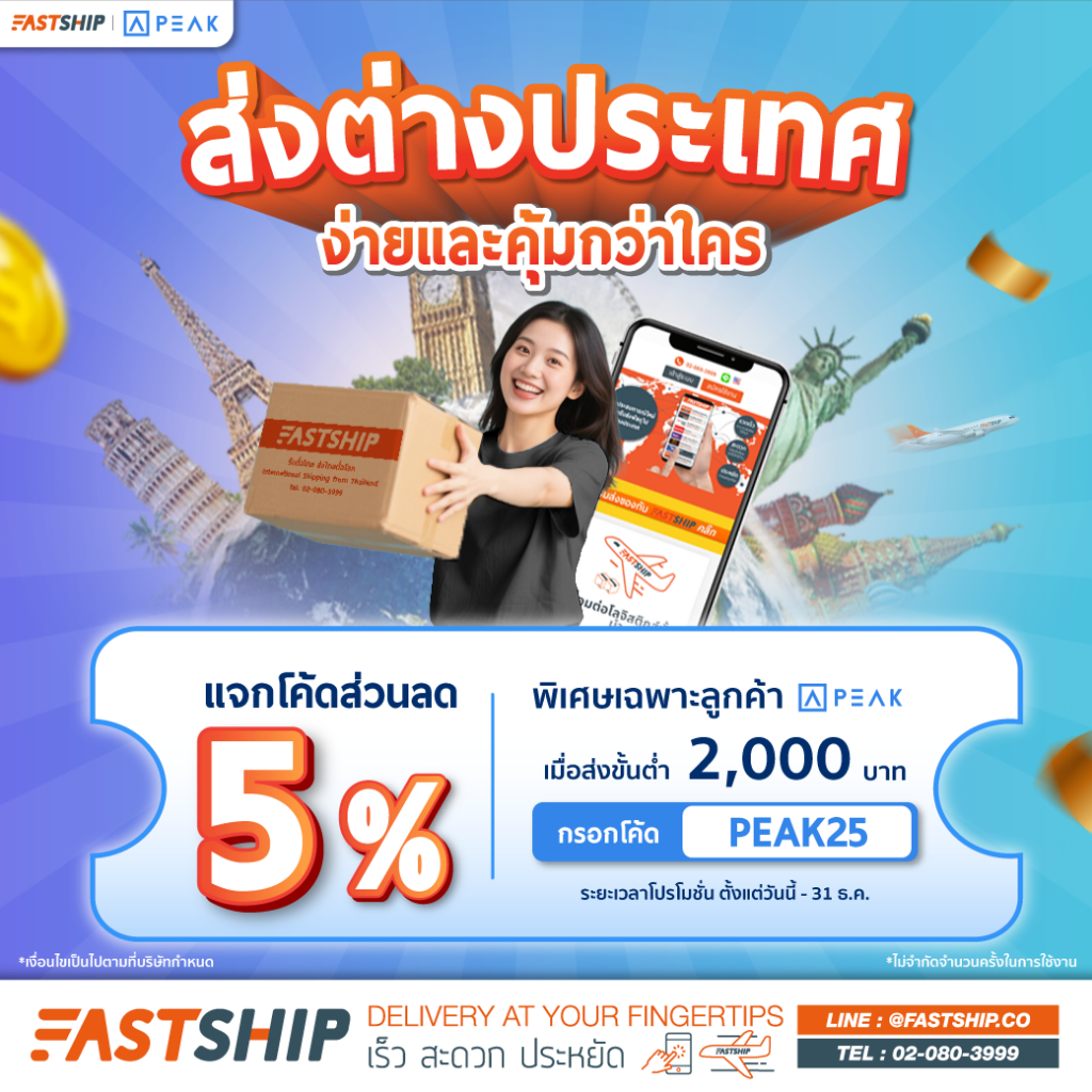 เพียงกรอกโค้ด “PEAK25” ตอนชำระเงิน รับทันที ส่วนลด 5% สำหรับค่าจัดส่งพัสดุไปต่างประเทศ