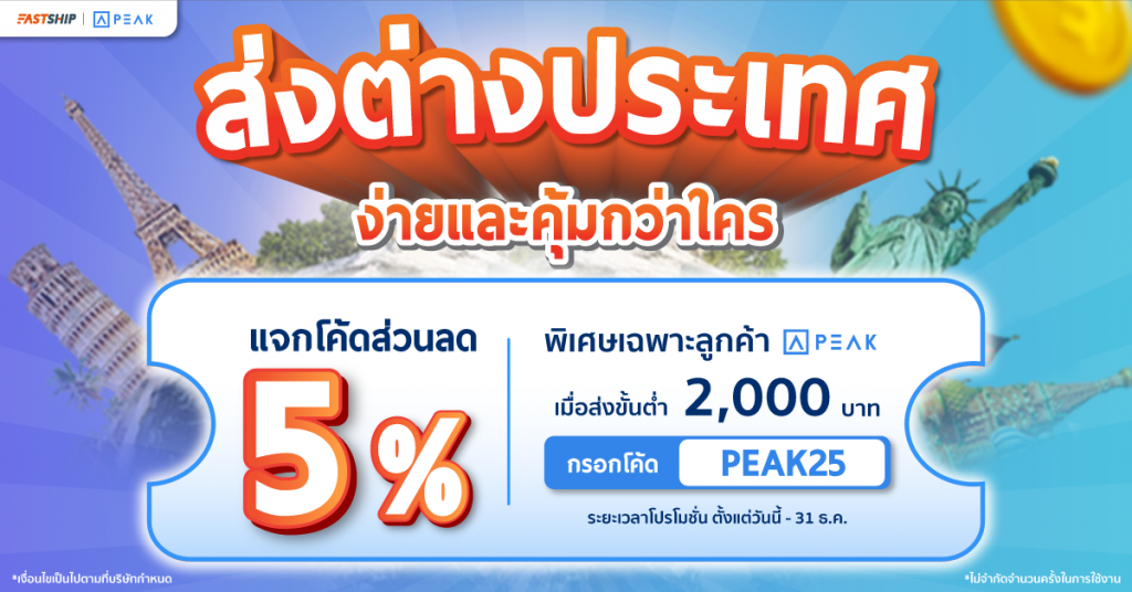 2. มอบส่วนลด 5% ใช้ได้เมื่อมียอดการส่งขั้นต่ำ 2,000 บาท/shipment กรอกโค้ด “PEAK25”