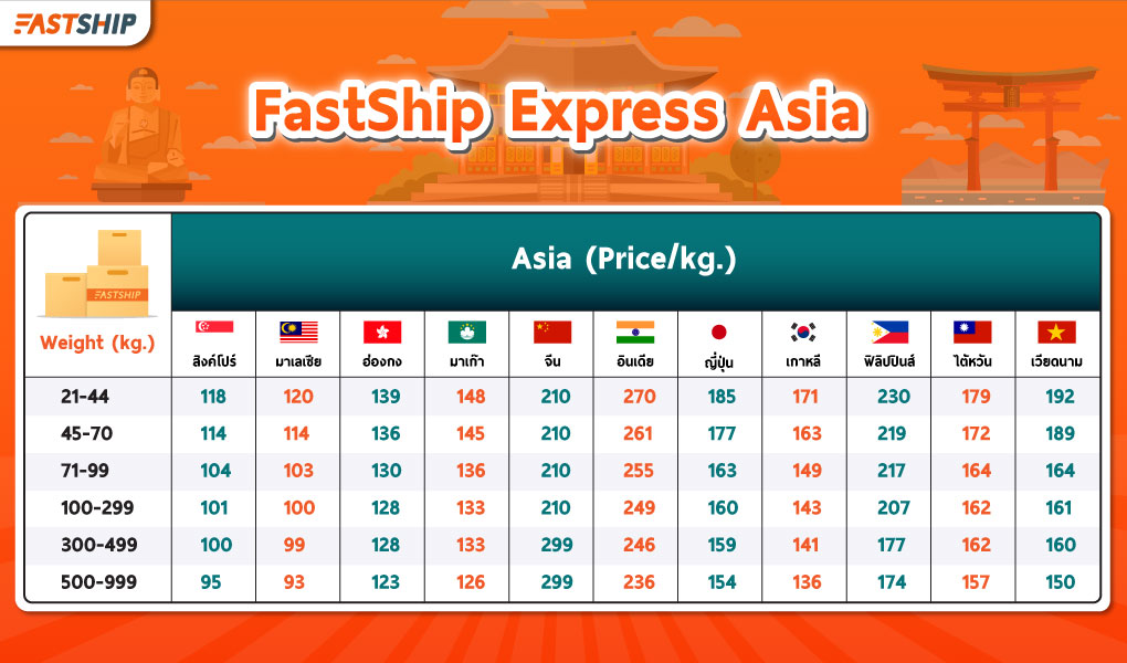 วันนี้ขยายความสุขมาถึงโซนเอเชียแล้ว สำหรับใครที่ต้องการส่งพัสดุไปประเทศโซนเอเชีย รับเรทสุดพิเศษ ถูกสุดเพียง 118 บาท/กิโลกรัม