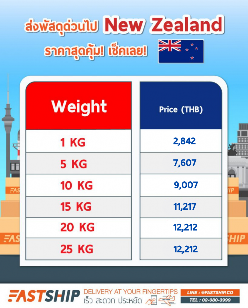FastShip บริการส่งด่วนไปต่างประเทศแบบ Express ใช้เวลาเพียง 3-5 วันทำการ เรามีราคาค่าขนส่งสุดพิเศษ สำหรับพ่อค้าแม่ขายออนไลน์ที่ต้องการส่งสินค้าไปนิวซีแลนด์ หรือผู้ที่ต้องการส่งของไปให้ลูกหลาน ญาติพี่น้อง ที่อยู่นิวซีแลนด์ เร่เข้ามาค่ะ! ส่งน้อยได้ราคาถูก ยิ่งส่งมากก็ยิ่งได้ราคาดี